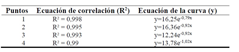 Valores para las ecuaciones de correlación y la curva exponencial para cada uno de los puntos analizados.