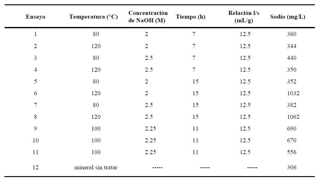 Se utilizó soluciónes de hidróxido de sodio con concentraciones de 2.0 M, 2.25 M y 2.5 M, con una relación volumen/precursor igual a 12.5 mL/g. Los ensayos se realizaron a 80, 100 y 120°C con tiempos de 7,11 y 15 horas respectivamente. Realizados los procedimientos se determinó la concentración de sodio en el material tratado con el método 9081 que incluye espectroscopia de absorción atómica en su etapa final, para luego a partir de los valores de concentración de sodio determinar la capacidad de intercambio catiónico de la zeolita sintética obtenida; los resultados se muestran en las tablas 1 y 2.
