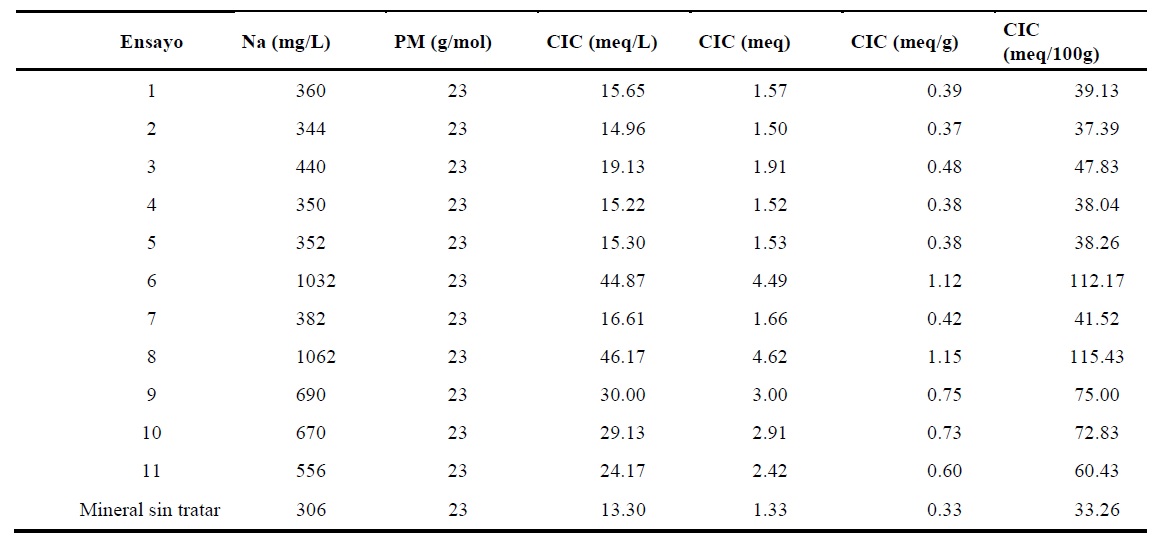 Como se aprecia en la tabla 1, se realizaron 12 ensayos en los cuales se determinó la concentración de Na, valor a partir del cual se determina la CIC. Se observa, para todos los casos, que el valor de la concentración de Na aumenta en todas las pruebas de activación realizadas. En el material zeolítico sintetizado el ADE, en este caso es el Na, que llena el interior de los poros estabilizando la estructura del mineral.