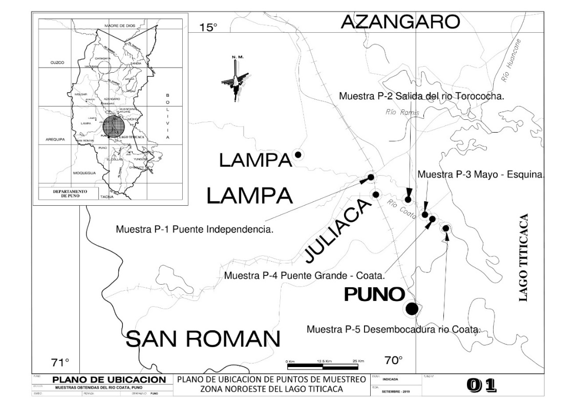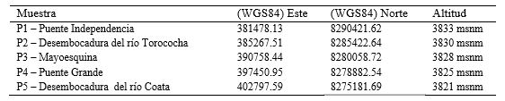 Las muestras fueron colectadas en la cuenca baja del rio Coata, desde la ciudad de Juliaca, hasta su desembocadura en el lago Titicaca, en dos periodos climáticos: avenida (marzo) y estiaje (junio) en el año 2017, en cinco puntos estratégicos que fueron georreferenciados (Tabla 1).