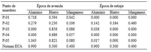 Se determinó la presencia de aluminio, hierro y manganeso con concentraciones por encima de los límites permisibles establecidos por los ECAs del Minam-Perú, índices preocupantes por la alteración de los sistemas acuáticos [23] .