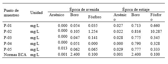 En la época de avenida el arsénico en el Punto P-05 (desembocadura del rio Coata) y el fósforo en los puntos de muestreo P-02 y P-03 superan los límites permisibles, mientras que en la época de estiaje el arsénico en los puntos de muestreo P-01, P-02, P-03 y P-05 y el fósforo en todos los puntos de muestreo superan los niveles permitidos de los ECA-Minam (Tabla 3). La excesiva concentración de fósforo que supera los límites permisibles (0.100 mg/L) en los ecosistemas acuáticos como es el caso del río Coata [13,14]. El incremento de la concentración de fósforo disminuye la concentración proporcional de nitrógeno [19], con la consecuente alteración de la habitabilidad del ambiente, reduciendo significativamente la capacidad de crecimiento y mantenimiento de las funciones vitales de los seres acuáticos [15-18]. La presencia elevada de fósforo favorece el proceso de eutrofización del agua [16], este proceso involucra un crecimiento descontrolado de algunas especies acuáticas en la superficie que terminan por impedir el paso de la luz [20], por lo que las algas del fondo no pueden realizar la fotosíntesis y el agua acaba perdiendo casi todo su oxígeno [4,21,22].