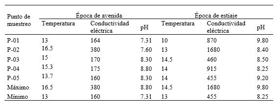 Se colectó muestras de agua de río por duplicado in situ, tomando en cuenta los parámetros químicos y físicos a saber: CND, pH y temperatura en cada uno de los cinco puntos de muestreo (Tabla 1), en las dos épocas, usándose un recipiente graduado y recipientes de polietileno de 500mL.