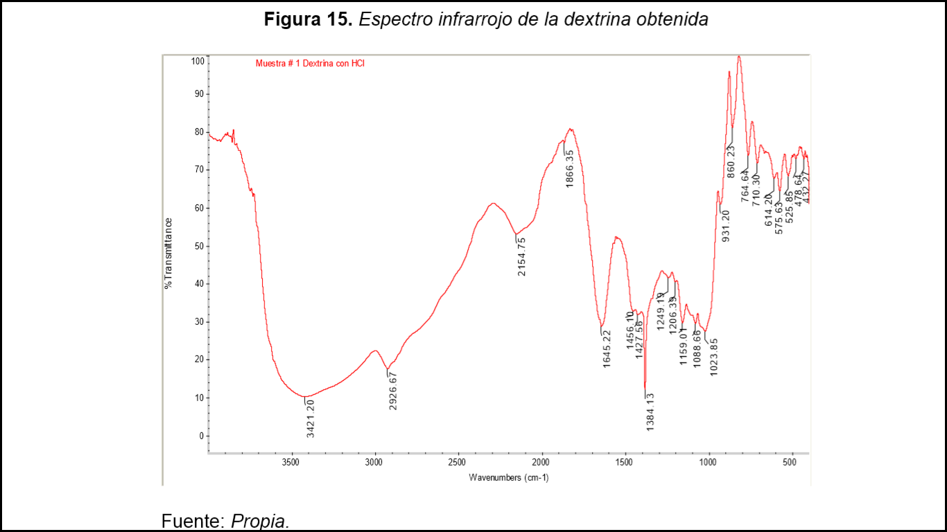 En la figura N°1 se presenta el espectro IR de la dextrina el cual se realizó para identificar los grupos funcionales en la muestra de dextrina. En el infrarrojo realizado se evidenció que las bandas de los 2900 a 3500 cm-1 son mucho más amplias debido a la gran cantidad de grupos OH- de los alcoholes presentes en la dextrina y la banda característica de los grupos etilos y metilos se encontró en los 900 a 1500 cm-1 comprobándose la composición de la misma.