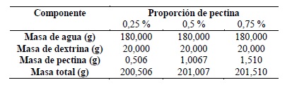 Formulación del pegamento con diferentes proporciones de pectina.