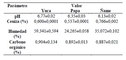 El porcentaje de ceniza representa la cantidad de materia mineral que forma parte de la composición del tubérculo, suele ser absorbida por el mismo como nutrientes a través del suelo, determinar su proporción es de gran importancia para conocer la pureza de las sustancias y compuestos obtenidos a partir de los residuos vegetales. Diferentes autores ubican el contenido de cenizas de yuca entre 0,6% y 0,9% [8], 0,4% a 0,6% para la papa [9] y entre 0,7% a 0,9% para el ñame [10], rangos entre los cuales se encuentran los valores correspondientes a las muestras analizadas.