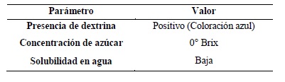 La dextrina obtenida se evaluó en cuanto a: Cambio de color [23]; Concentración de azúcar [24] y Solubilidad en agua [25].
