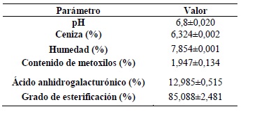 Y a la pectina se le determinó: Humedad [14]; Cenizas [20]; pH [19]; porcentaje de metoxilo, grado de esterificación, porcentaje de ácido anhidrourónico y grado de gelificación [26]