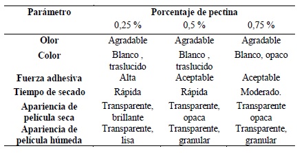 En la tabla N°4, se resumen las características determinadas a los diferentes pegamentos formulados. Las tres muestras elaboradas adicionando pectina en diferentes proporciones presentaron agradable olor y coloraciones que fueron desde el blanco traslucido hasta blanco opaco a medida que aumentaba la cantidad de pectina en su composición.