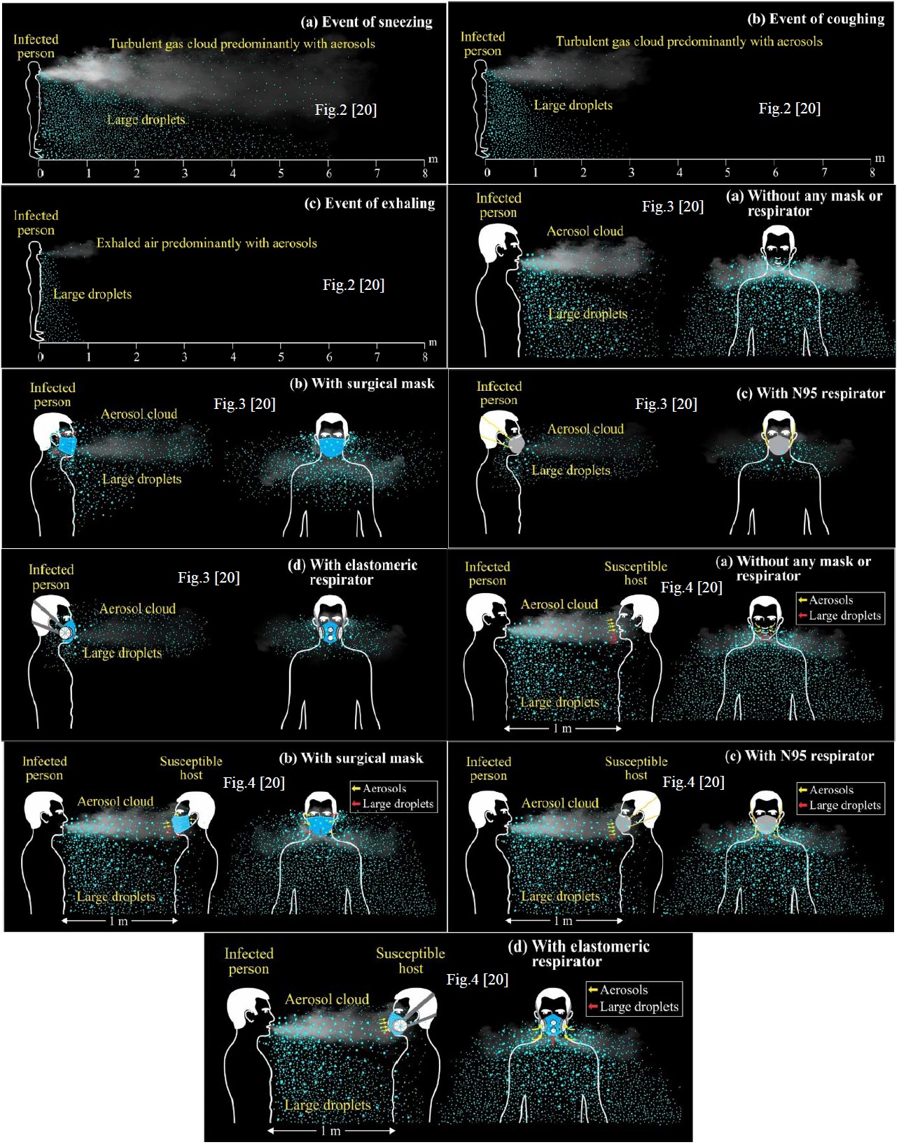 Sin embargo, algunos estudios han medido con éxito la viabilidad de las partículas de virus transmitidas por aerosoles. Un equipo de la Dirección de Ciencia y Tecnología del Departamento de Seguridad Nacional de EE. UU. (Washington DC) descubrió que las condiciones ambientales juegan un papel importante en el tiempo que las partículas de virus en aerosoles permanecen viables. El SARS-CoV-2 en aerosoles de saliva simulados perdió el 90% de su viabilidad en 6 minutos de exposición a la luz solar del verano, en comparación con 125 minutos en la oscuridad. Este estudio sugiere que los ambientes interiores pueden ser especialmente riesgosos, porque carecen de luz ultravioleta y porque el virus puede volverse más concentrado que en los espacios al aire libre. Este último hallazgo desalienta fuertemente la política del aislamiento o cuarentena: “quédate en casa”, en especial si ya hay algún infectado o pacientes particularmente vulnerables. En el Reino Unido se dice que hay evidencia débil de transmisión de aerosoles en algunas situaciones, pero el grupo recomienda, no obstante, "que las medidas para controlar la transmisión incluyan aquellas que se dirigen a las rutas de aerosoles". Cuando el Reino Unido revisó sus pautas de distanciamiento físico, recomendó a las personas que tomen precauciones adicionales en situaciones en las que no es posible mantenerse a 2 metros de distancia. El consejo incluye recomendaciones para usar una mascarilla y evitar interacciones cara a cara, mala ventilación y hablar o cantar en voz alta [16]. Chia et al. [17] llevaron a cabo la detección de SARS-CoV-2 RNA dentro de ambientes de un hospital albergando pacientes con el virus manifiesto. Sus conclusiones muestran la presencia de RNA de coronavirus en algunas pocas superficies de pocos ambientes. En cuanto a la presencia en el aire, el COVID-19 fue detectado en dos de tres ambientes examinados. Ng et al., [18] realizaron un análisis del contagio o superación del mismo del personal de salud de un hospital en el tratamiento de un paciente de neumonía por coronavirus. Su discusión versa sobre la protección ofrecida por el uso de mascarilla quirúrgica y la N95 por dicho personal del cual al menos el 85% estuvo expuesto a un posible contagio por vía aérea (aerosoles). Sus resultados muestran que nadie del personal contrajo la enfermedad. Esto indica que, o el contagio por aerosoles no es impactante, o que, si lo es, las mascarillas lo evitaron. No se mencionan datos de personal que no usó la mascarilla. Los estudios sobre aerosoles de origen respiratorio o fecal realizados en un hospital con pacientes de coronavirus por Ding et al. [19], muestran los resultados obtenidos de un total de 107 muestras de superficie, 46 muestras de aire, dos muestras de condensado exhalado y dos muestras de aire expirado dentro y más allá de cuatro salas de aislamiento de tres camas. Las 107 muestras de superficie comprendían 37 de los inodoros, 34 de otras superficies en salas de aislamiento y 36 de otras superficies fuera de las salas de aislamiento en el hospital. Cuatro de estas muestras fueron positivas, a saber, dos manijas de las puertas de las salas, una tapa del asiento del inodoro del baño y una manija de la puerta del baño. Tres fueron débilmente positivos, a saber, un asiento de inodoro de baño, una palanca de grifo de lavabo de baño y una rejilla de escape de techo de baño. De las 46 muestras de aire, una recolectada de un corredor fue débilmente positiva. Las dos muestras de condensado exhalado y las dos muestras de aire exhalado fueron negativas. Los aerosoles de origen fecal en los inodoros de los pacientes contenían la mayor parte del SARS-CoV-2 detectado en el hospital, lo que destaca la importancia de la higiene de superficies y manos para la intervención. Este estudio [19] deja ver que la transmisión viral aérea con potencial contagioso no es necesariamente contundente, como señalan otros autores. Jayaweera et al. [20] realizaron el estudio del ambiente inmediato al individuo virulento (COVID-19) en cuanto a las longitudes de alcance de aerosoles y gotas en eventos como el estornudo, la tos, el parlamento y la exhalación, con y sin uso de mascarilla, quirúrgica y N95. Entre los numerosos resultados e hipótesis que muestra este enfoque [20], los más relevantes son las figuras 2, 3 y 4, que muestran el alcance de aerosoles y gotas en cada uno de los eventos antes mencionados. La figura 2 muestra el perfil de las trayectorias de gotas y aerosoles de un paciente infectado sin uso de mascarilla en (a) un evento de estornudo con gotas que viajaron hasta 6 m a una velocidad de 50 m / s en solo 0.12 s, la parte superior del caudal corresponde al aerosol y la inferior a las gotas de agua grandes, la mayor concentración según el gráfico en ambos caudales se observa hasta los 2 m de distancia de la fuente, (b) un evento de toser con gotas que viajaron hasta los 3 m a una velocidad de 10 m / s en 0.2 s, la mayor concentración según el gráfico en ambos caudales se observa hasta 1 m de distancia de la fuente y (c) un evento de exhalar con gotas que viajaron durante 1 m a una velocidad de 1 m / s en 1 s, el gráfico no permite distinguir un área de mayor concentración en ambos caudales siendo esta casi constante hasta 1 m de distancia de la fuente. La figura 3 muestra de perfil y de frente (a lo largo y a lo ancho), las trayectorias de gotitas y aerosoles de un paciente infectado en caso de tos con diferentes mascarillas y respiradores usados (a) sin mascarilla o respirador (b) con mascarilla quirúrgica (c) con respirador N95 (d) con respirador elastomérico reutilizable. En los 3 casos (b, c, d), el caudal de gotitas y de aerosoles disminuye a un 50% o más (grosso modo) en relación a los caudales emitidos sin mascarilla (a). El filtrado va mejorando en b) respecto a la ausencia de filtro, en c) respecto de d) y el mejor filtrado es en d). La figura 4, muestra vistas d