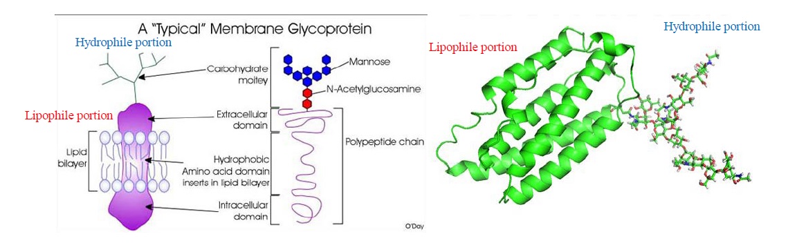 Representaciones de las glicoproteinas transmembranales M, a la izquierda, se ve la liposolubilidad de la parte proteica de la glicoproteína dentro de la bicapa lipídica y porciones estructurales fuera de la membrana, para interacciones con grasas, a la derecha la estructura de una glicoproteína, no se hallaron advertencias de protección de copyright de las imágenes en imternet / Representations of the transmembrane glycoproteins M, on the left, the liposolubility of the protein part of the glycoprotein is seen within the lipid bilayer and structural portions outside the membrane, for interactions with fats, on the right the structure of a glycoprotein, not Image copyright protection warnings were found on the Internet[§§§]