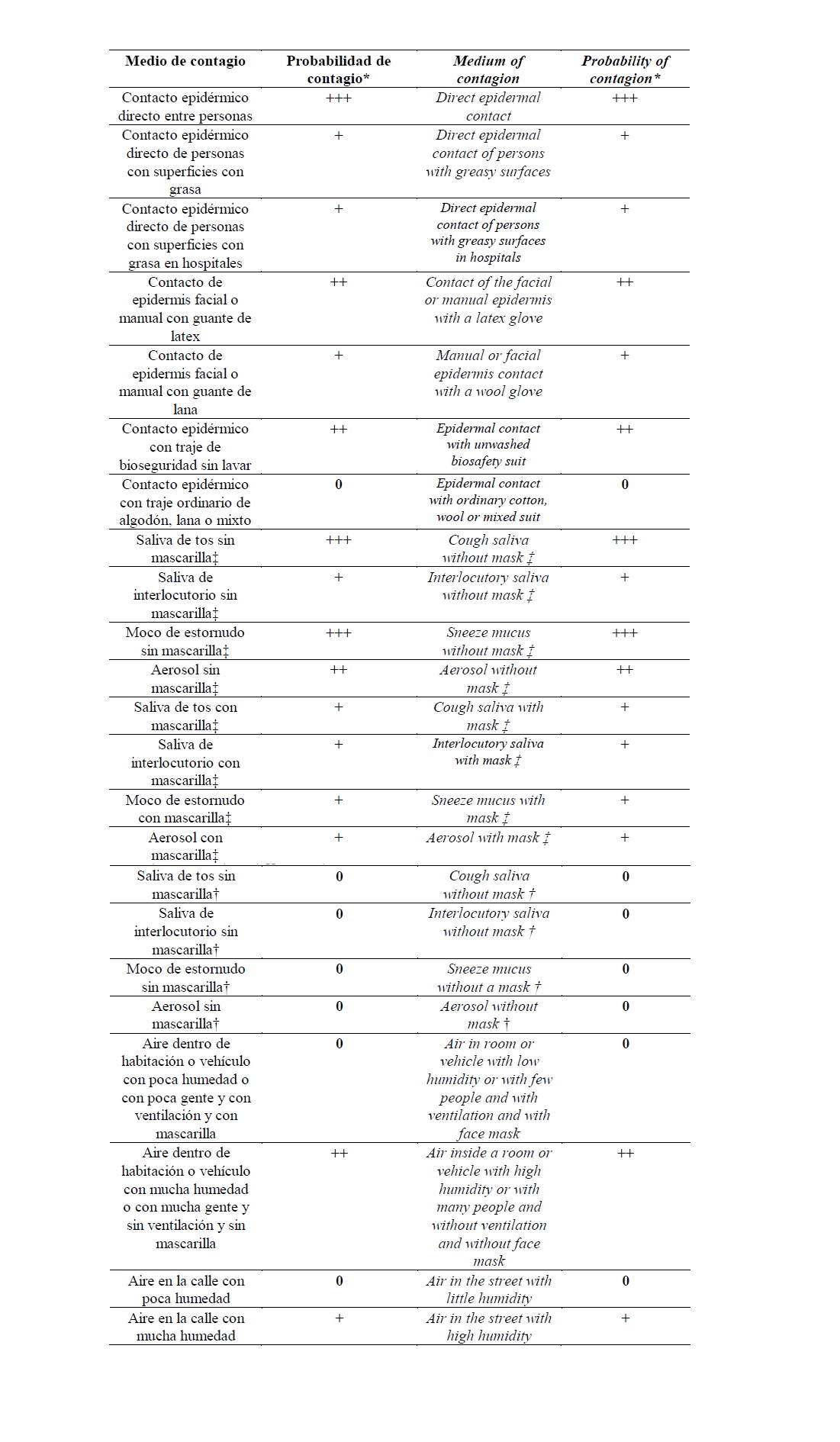 Probabilidad de contagio de COVID-19, o cualquier otro virus, según los medios de contagio/ Probability of contagion of COVID-19, or any other virus, according to the contagion media