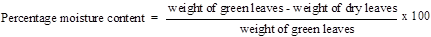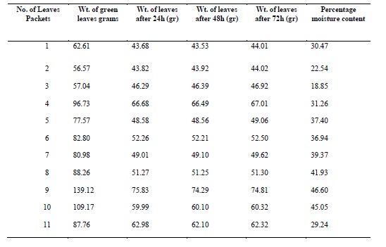 The collected leaves sample of Syzygium cumini was weighted on Citizen CTG 3000E electronic balance. The leaves dried in oven (Gallenhamp Incubator Model IH-150) at 50-60ºC. The dried leaves were cooled at room temperature and weighted again on Citizen electronic balance. Weight of green leaves, dried leaves and value of percentage moisture content in various samples of Syzygium cumini is given in Table 1. The weight of ground leaves of Syzygium cumini was found to be 560 grams.