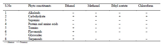 It is observed from Table 5 that Phyto-constituent (carbohydrate) is present in the extract of each solvent. Alkaloids are not detected in all four (ethanol, methanol, ethyl acetate and chloroform) solvent extracts. Glycoside is not detected in the ethanol solvent extract. Glycosides tests for methanol, ethyl acetate and chloroform extracts could not be performed. Saponins are only tested in methanol solvent. Tannins and flavonoids are tested in ethanol extracts only. Ethanol solvent is found to be more effective solvent for the phytochemical screening of Syzygium cumini leaves extract.