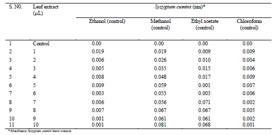 *Absorbance Syzygium cumini leave extractsAntimicrobial activity of Syzygium cumini leaves extract against gram positive and negative bacteria and Candida albicans fungus are summarized in Table 3 and in the Table 4 by disc diffusion and poison plate methods, respectively.