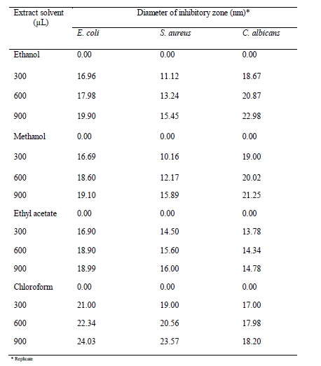 * ReplicateIn ethyl acetate extract maximum (24.03 nm; 900 µL) and minimum (17.00 nm; 300 µL) inhibitory zone was observed for Escherichia coli and Candida albicans, respectively. In chloroform extract maximum (24.33 nm; 900 µL) and minimum (17.30 nm; 300 µL) inhibitory zone was observed for Escherichia coli and Candida albicans, respectively.