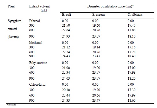 – = Absence + = Presence(i) Syzygium cumini leave extracts were found to have antimicrobial, antifungal and antioxidant properties.