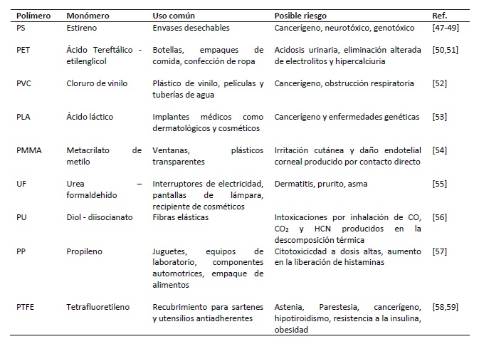 Otro punto de vista a considerar es que los polímeros están compuestos de subunidades llamadas monómeros (Tabla 2), de los cuales muchos son tóxicos y están vinculados a enfermedades como el cáncer y anormalidades reproductivas en humanos, roedores e invertebrados [9]. Un ejemplo es el polímero de PS del que su toxicidad como polímero es aún incierta, pero su monómero (el estireno) es un conocido tóxico y está clasificado como una sustancia potencialmente cancerígena. Estudios in-vivo sugieren que las nanopartículas de PS pueden penetrar a los organismos a través de la piel y llegar a las vías respiratorias y digestivas [47]. Estos estudios confirman y refuerzan la idea del potencial riesgo a la salud que podría representar la ingestión de partículas de ciertos MPs para organismos vivos. Los posibles riesgos asociados a otros monómeros pueden observarse en la tabla 2.