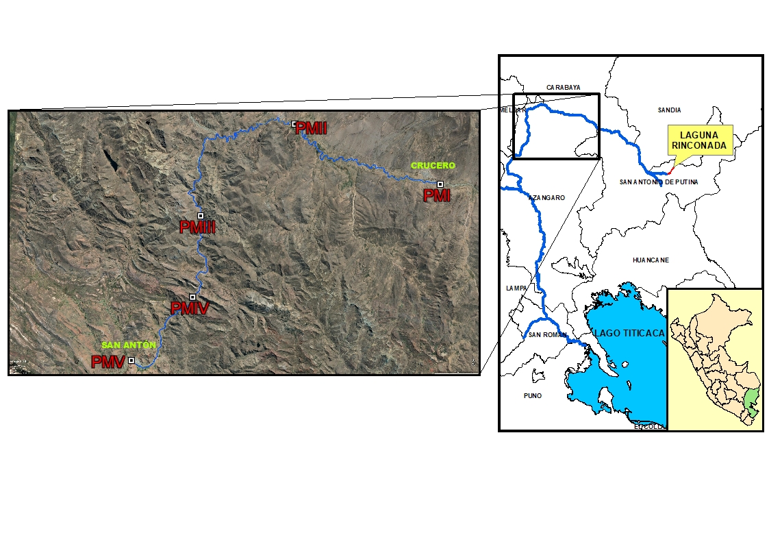 El área de estudio está localizada en la cabecera de cuenca del río Ramis, en donde se realizan actividades mineras y metalúrgicas. El río Crucero se origina en la laguna Rinconada y discurre aguas abajo, uniéndose a otros ríos hasta desembocar en el lago Titicaca. Para esta investigación se consideró el tramo Crucero – San Antón (Figura 1), con una longitud de 83.7 km., ya que estos distritos son los primeros en recibir las descargas del río para utilizarlas en sus actividades domésticas y agropecuarias.