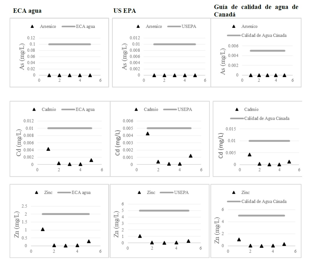 Como se puede apreciar en la Figura 2, las concentraciones de cadmio y zinc en agua están por debajo de los Estándares de Calidad Ambiental de Perú (ECA) y de los criterios internacionales proporcionados por la Asociación de Protección Ambiental de Estados Unidos (US EPA) y la Guía de Calidad de Agua de Canadá [21-23].