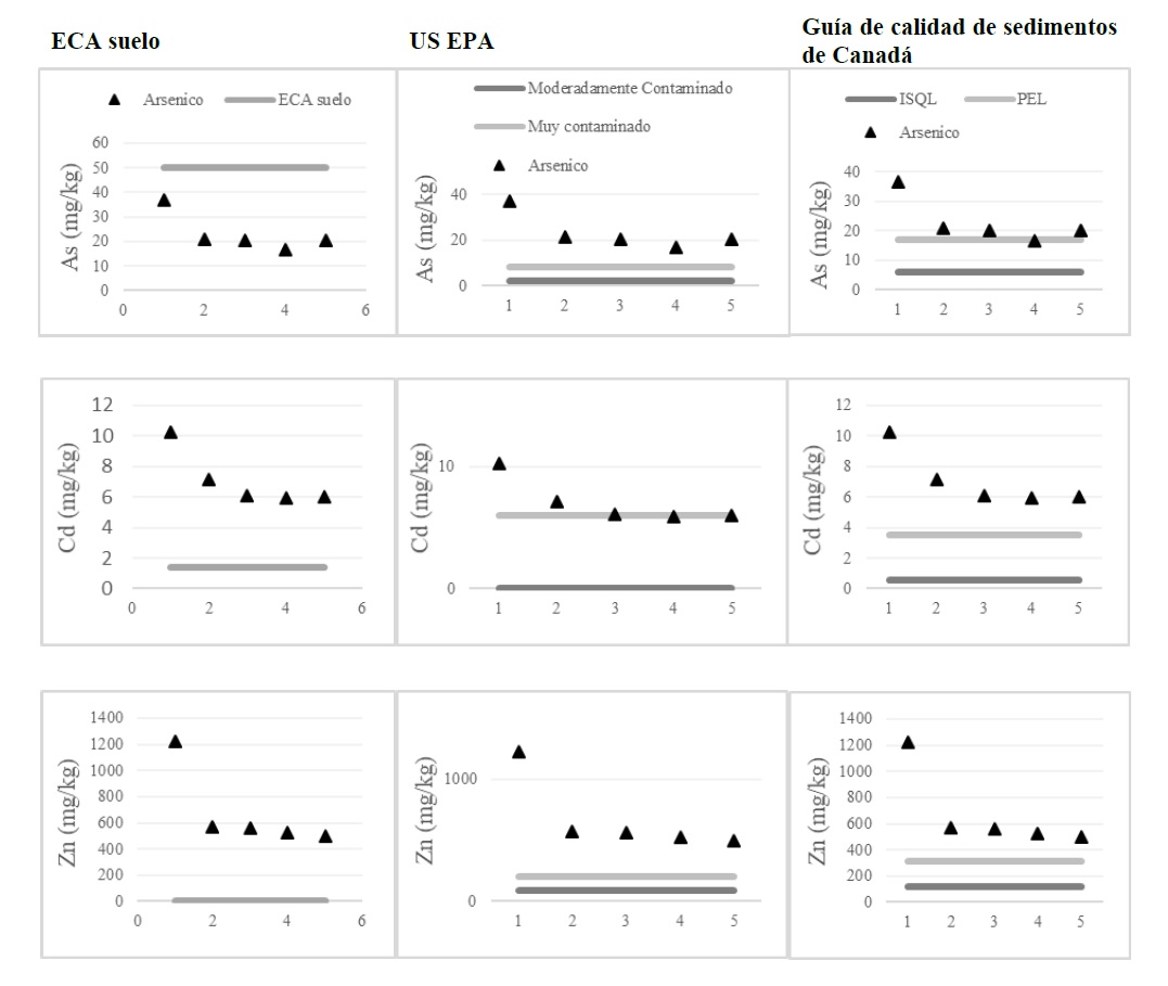 Casi todos los puntos de muestreo presentan concentraciones de arsénico, cadmio y zinc que se encuentran en el límite o superan los valores límites recomendados por los estándares nacionales e internacionales [24,25], excepto en PMI, en donde las concentraciones de arsénico se encuentran por debajo de los ECA (Figura 3).