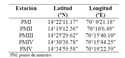 Se seleccionaron cinco estaciones de monitoreo (Tabla 1) los cuales se establecieron en cumplimiento del Protocolo Nacional para el Monitoreo de la Calidad de Recursos Hídricos Superficiales del Perú [19], mediante el sistema de posicionamiento global (GPS, Garmin eTrex 20). En cada estación se realizaron mediciones de parámetros fisicoquímicos in situ a lo largo del tramo del río Crucero, durante la época seca. El pH, la conductividad eléctrica (CE) y temperatura del agua (T) se midieron utilizando un multiparámetro (HI98204, HANNA), el equipo fue calibrado antes de su uso.