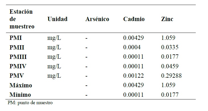 En la Tabla 3 se reportan las concentraciones de cadmio y zinc en agua, las cuales son mayores en PMI (1.059 mg/L) y PMV (0.29288 mg/L), mientras que las concentraciones de arsénico están por debajo del límite de detección (0.00003 mg/L) en todos los puntos de muestreo.