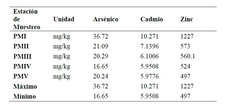 La Tabla 4 muestra los resultados de las concentraciones de arsénico, cadmio y zinc presentes en muestras de sedimentos tomadas en cada una de las estaciones. La estación PMI es la zona que presenta mayor concentración de los metales antes mencionados.