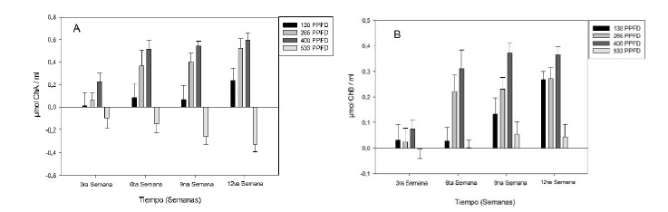 Concentración de ChA (A) y ChB (B) por extracción etanólica cada tres semanas de los tratamientos 130 a 533 PPFD. La concentración se calculó de la resta de los parámetros final vs inicial de cada muestreo.