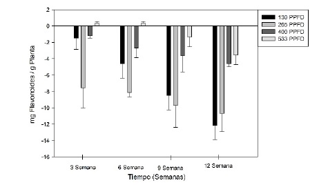 Respecto a la concentración de flavonoides no se presentó diferencias significativas al finalizar la experimentación, los tratamientos 130, 265, 400 y 533 PPFD mostraron un decremento de la concentración respecto al tiempo de experimentación, únicamente el tratamiento 533 PPFD mostro un leve incremento en la concentración de flavonoides (1.3mg/g) hasta la sexta semana (figura 2), este incremento puede ser producido como un mecanismo de defensa para asegurar la funcionalidad en las hojas, por el contrario, bajas concentraciones de luz disminuyen la concentración de flavonoides [30].