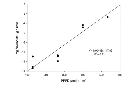 Analizando la última semana de experimentación (figura 3) se observa que la concentración de luz tiene relación directa con la concentración de flavonoides de manera lineal Y= 0.00488x - 17.99 (R2 de 0.91), donde existiría menor concentración de flavonoides a menor concentración de Luz. Estos resultados son comparables con otros estudios donde se indica que la producción de flavonoides es favorecida por altos niveles de radiación solar y disminuyen si no existe el estímulo adecuado [31-35].