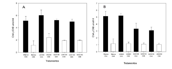 Concentración de ChA (A) y ChB (B) por extracción etanólica a las 8 semanas de los tratamientos A) UVA, B) UVB y control luz blanca. La ChA se muestra en columnas negras y la ChB en columnas blancas.