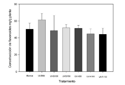 Los resultados respecto a la concentración de flavonoides muestran diferencias significativas (H = 2.73, sig. = 0.04), se observa una mayor concentración en el tratamiento UVB50 (60.01 mg/g) en comparación de del control (46.13 mg/g), sugiriendo que bajos niveles de UVB favorecen a la concentración de flavonoides (figura 5, tabla 8 y 9), los demás tratamientos muestran resultados similares entre ellos (figura 5, tabla 9) siendo el tratamiento UVA150 el que presenta menor concentración (42.42 mg/g). Exposiciones prolongadas a altos niveles de luz pueden aumentar la concentración de flavonoides independientemente de las longitudes de onda [46-47]. Además, existe acumulación de flavonoides en relación al PAR, UVA o UVB diferenciadas, variar las longitudes de onda estimula diferentes flavonoides como por ejemplo el kaempferol es estimulado por el PAR y bajas dosis de UVA, en cambio la quercetina es estimulada por UVB y UVA, siendo así que la concentración de flavonoides totales puede ser similar, pero con diferentes composiciones [48-49]. Nuestros resultados también muestran que bajas dosis de UV pueden activar la síntesis flavonoides y acumularlos, en cambio dosis más altas de UV posiblemente pueden activar su utilización en la planta y reducir la concentración de los mismos, sin embargo, no muestran una tendencia lineal en UVB (y=73.86 –0.15x; R2 = 0.67) o UVA (y=60.97 –0.16x; R2 = 0.79).