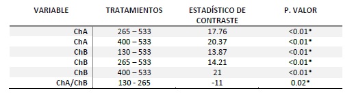Los resultados para la concentración de clorofilas muestran diferencias significativas en UVA y UVB respecto al tratamiento control (ChA H = 29.75, sig. = <0.01 y ChB = 27.33, sig. = <0.01) (tabla 8). El tratamiento en el que se observa mayor concentración de ChA y ChB es el UVA50 (5.95 umol/ml ChA y 2.13 umol/ml ChB), en cambio los tratamientos UVB100 y UVB150 (3.06 umol/ml ChA, 0.69 umol/ml ChB y 3.32 umol/ml ChA, 1.07 umol/ml ChB respectivamente) muestran disminución de la ChA en relación a la luz blanca (4.98 umol/ml ChA y 1.38 umol/ml ChB) (figura 4, tabla 8 y 9).