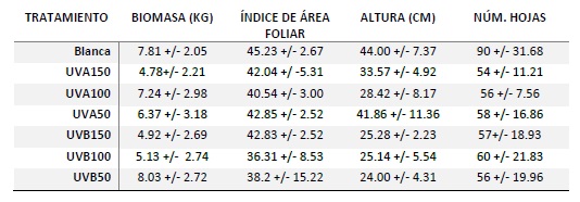 Valores de los promedios y desviación estándar de las variables de crecimiento, Biomasa, Índice de Área foliar altura de planta y número de hojas de los tratamientos UVA, UVB y control blanco a las 8 semanas.