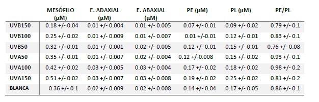 La disminución de clorofilas en los tratamientos UVB150 y UVB100 comparados con el control luz blanca y los otros tratamientos puede ser explicada debido a que las moléculas de clorofila son susceptibles a daños por fotoxidación causados por irradiaciones de alta intensidad como la UVB [42]. En cambio, bajas concentraciones de luz (UVA50) estimulan mecanismos para aumentar la densidad de pigmentos [43-44]. Además, la concentración de clorofilas parece no ser afectada en periodos cortos de irradiación, pero en exposición continua a radiaciones UVB100 y UVB150, como en nuestro diseño, causa una disminución de ChA - ChB, y puede estar relacionada a lesiones en los tilacoides [45].