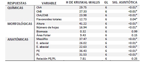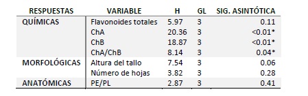 Prueba Kruskal – Wallis en relación a las variables de respuesta fase 2, se observa diferencias significativas en las variables químicas Clorofila A (ChA) (<0.01), Clorofila B (ChB) (<0.01), Flavonoides totales (0.04); en las variables de crecimiento altura de la planta (<0.01), Número de hojas (<0.01); y variables anatómicas ancho de mesófilo (<0.01), ancho de epidermis adaxial (<0.01), ancho de epidermis abaxial (<0.01), parénquima en empalizada (<0.01) y parénquima lagunar (<0.01).