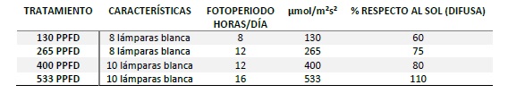 Para la experimentación de la fase 1 se armaron cuatro tratamientos de luz blanca donde se varió el número de lámparas y las horas luz con el fin de simular horas acumuladas de radiación solar (tabla 1). El experimento tuvo una duración de tres meses y se detuvo al observar reducción en la vitalidad de las plantas.