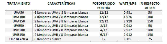 Los tratamientos de irradiación se dividieron en dos etapas, la aclimatación de plantas (Fase 1) y posteriormente la inducción al estrés ultravioleta (Fase 2). Las lámparas utilizadas fueron TL-D 36W/54-765 1SL (400-700 nm) para el PAR (Radiación Fotosintéticamente Activa), TL-K 40W/10-R UVA (315- 380nm) para UVA y TL 40W/12 RS SLV/25 (290 – 315nm) para UVB todas de la marca PHILIPS. La caracterización se realizó con dosímetro Gigahertz-Optick XD-9501 y medidor PAR LGBQM Hydrofarm.