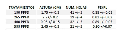 Valores de los promedios y desviación estándar de las variables, altura de la planta, número de hojas y relación parénquima en empalizada / parénquima lagunar (PE/PL) de los tratamientos 133 – 533 PPFD a las 12 semanas.