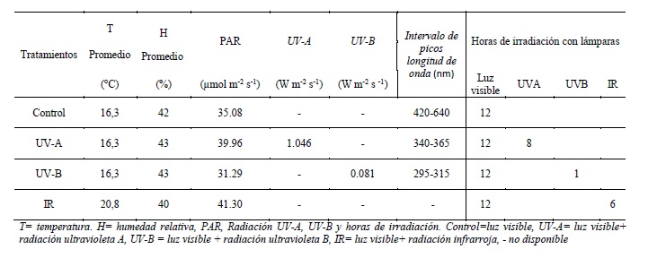 T= temperatura. H= humedad relativa, PAR, Radiación UV-A, UV-B y horas de irradiación. Control=luz visible, UV-A= luz visible+ radiación ultravioleta A, UV-B = luz visible + radiación ultravioleta B, IR= luz visible+ radiación infrarroja, - no disponible
