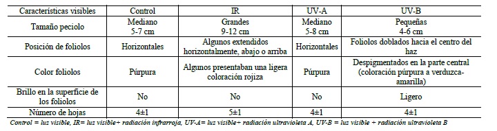 La coloración rojiza que presentaron los individuos en el tratamiento con radiación IR (Tabla 2, Figura 3B), podría deberse a niveles de FR (rojo lejano). Esta suposición se basa en otros estudios que probaron que ante FR, la concentración tanto de clorofila como de antocianinas tienden a disminuir [20]. El grupo control en este estudio muestra que las hojas tienen una coloración púrpura debida a la presencia de antocianinas en sus hojas [17,23], por lo que, la perdida de coloración púrpura de los foliolos de Oxalis triangularis pudo haber ocurrido por la disminución de esos pigmentos, ya que este tratamiento tiene lámparas incandescentes infrarrojas que emiten principalmente en FR.