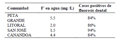 · Es necesario implementar un sistema de tratamiento previo a la distribución del agua subterránea, toda vez que el consumo de agua con elevadas concentraciones de F- puede causar diferentes tipos de enfermedades (OMS, Agua saneamiento y salud), como la fluorosis dental que ya se hace latente en las comunidades de: Peta Grande, Litoral, San José y Canandoa.