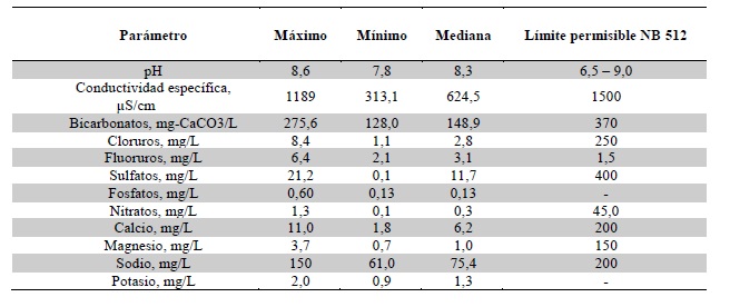 La Tabla No. 2 despliega los resultados de los análisis físico-químicos de las muestras colectadas en 16 pozos en diferentes comunidades del Municipio de San Pedro. Los parámetros medidos en campo mostraron valores de pH ligeramente alcalinos, comprendidos entre 7,8 y 8,6 con una mediana de 8,3. La conductividad eléctrica varió en un amplio rango desde los 313,1 hasta los 1189 μS/cm y una mediana igual a 624,5 μS/cm. La concentración de F- en todas las muestras es muy elevada de 2,1 hasta los 6,4 mg/L, superando en todas las muestras el límite permisible de 1,5 mg/L establecido por las guías de la OMS y la norma boliviana NB 512 para agua potable [13].