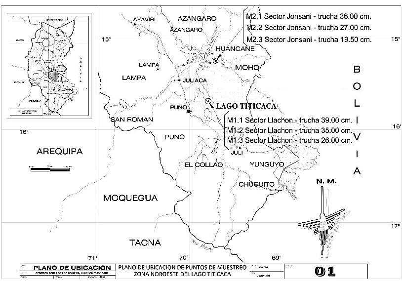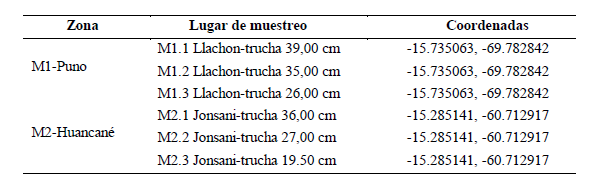 El estudio fue de tipo descriptivo, transversal y observacional que se desarrolló en las provincias de Puno y Huancané. Las tomas de muestras de truchas arcoíris (Oncorhynchus mykiss) se realizaron en dos zonas de muestreo, correspondientes a los lugares: M1.1-Llachon (-15.275924, -68.810590); M1.2 Llachon (-15.735063, -69.782842); M1.3 Llachon (-15.735063, -69.782842) que corresponden a la provincia de Puno, y los lugares: M2.1 Jonsani (-15.285141, -60.712917); M2.2 Jonsani (-15.285141, 60.712917) y M2.3 Jonsani (-15.285141, 60.712917) que corresponden a la provincia de Huancané (Tabla 1).