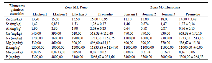 Los elementos químicos que se encontraron en el músculo axial de trucha arcoíris (Oncorhynchus mykiss) pueden clasificarse en el grupo de los elementos esenciales [5,7] como: Fe, Cu, Zn, Se, Al, Ca, Na, K y Mg. Se observó que los elementos químicos esenciales presentes en las muestras del musculo axial de las truchas de la provincia de Puno son: Zn (15,00 ± 0,95 mg/kg); Se (1,26 ± 0,37 mg/kg); Al (2,03 ± 0,23 mg/kg); Ca (513,33 ± 112,40 mg/kg); Na (1733,33 ± 152,75 mg/kg); Mg (496,00 ±35,12 mg/kg); K (11333,33 ± 1154,70 mg/kg); Mn (0,07 ± 0,02 mg/kg) y P (5066,67 ± 251,66 mg/kg), mientras que la concentración de elementos esenciales en las muestras del musculo axial de las truchas de la provincia de Huancané son: Zn (14,30 ± 3,48 mg/kg); Se (1,27 ± 0,34 mg/kg); Al (0,76 ± 0,15 mg/kg); Ca (663,33 ± 170,10 mg/kg); Na (1733,33 ± 513,16 mg/kg); Mg (586,67 ± 15,28 mg/kg); K (11000,00 ± 0,00 mg/kg); Mn (0,16 ± 0,06 mg/kg) y P (5300,00 ± 264,58mg/kg) (Tabla 2), estos elementos químicos no superan los límites permisibles en concentración [19,20], por lo que constituyen una fuente importante de proteínas y ácidos grasos omega-3 esenciales conocidos como DHA (ácido docosahexaenoico) y EPA (ácido eicosapentaenoico) y vitaminas.