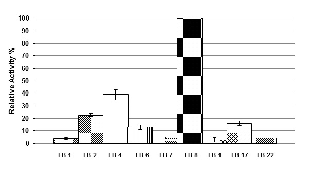 Cellulase relative activity (%) from strains LB-1, LB-2, LB-4, LB6, LB-7, LB-8, LB-13, LB-17 and LB-22 using filter paper, 1% (w/v), as carbon source after 12 hours incubation. Error bars represent the mean ± 2SD of duplicate samples.
