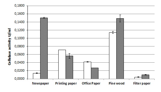 Those strains selected as best cellulase producers were cultivated in liquid culture medium (QM/HM) supplemented with 1% (w/v) organic waste individually: forest products like pine wood and different types of paper (newspaper, printing paper, office paper and filter paper) as well as agro-industrial waste like wheat straw, corn stalk, corn leaves, banana peel, sugarcane, and rice husks as carbon source. The cultures were grown at 30 ºC, 200 rpm for 15 hours, samples were taken each 3 hours and the cell-free supernatant after centrifugation was analyzed for cellulase enzyme activity, measurements were performed in duplicate. All the substrates used were rinsed twice with distilled water, dried at 50°C, stored at -20°C until use and sterilized with the medium.