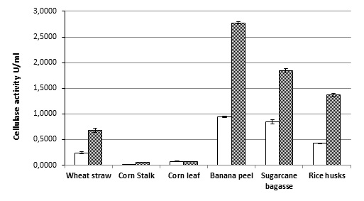 Enzyme production can be improved in order to generate a suitable technology for economical processes. Different strategies have been implemented based in low-cost residues for cellulase production identifying major parameters affecting enzyme production [25-27]. The nine strains tested positive for cellulase production presented both halophilic and alkalotolerant properties. Strain LB-8 was able to growth at pH values ranging from 6 to 9; meanwhile positive cellular growth was observed at NaCl concentration up to 15 % (w/v). The use of agro-industrial waste like banana peel, sugarcane bagasse, rice husks, and wheat straw by strains LB-4 and LB-8 revealed better values of enzyme production from those values determined using forest products. This study presents several options of low-cost substrate to support cellulase production by these strains.