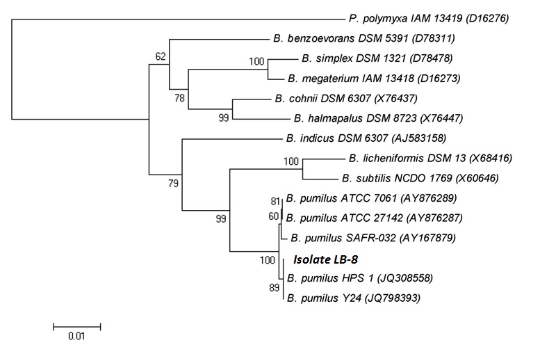The isolate was identified on basis of 16S rRNA sequencing. A comparison of the DNA sequence with sequences in the National Center for Biotechnology Information (NCBI) database with BLAST software showed 99.99 % sequence identity with the published 16S rRNA sequences of Bacillus pumilus. The phylogenetic tree showed that strain LB-8 formed evolutionary lineage with members of the Bacillaceae family associated with members of the diverse Bacillus spectrum (Fig. 4). Several bacterial strains of Bacillus, Pseudomonas, Clostridium and Cellumonas have shown cellulolytic activity under various culture conditions [22, 23]. Some strains belonging to this species have been reported for its ability of cellulase production, nevertheless, enzyme characterization reveals that this enzyme was optimally active at pH 6 and temperature 60 ºC meanwhile the enzyme in this study is optimally active at pH 9 and temperature 50 ºC [24].